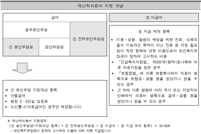 - 지원 제외 항목: 미용·성형, 특실/1인실 이용료, 간병비, 효과가 검증되지 않은 고가 치료법, 1만원 미만의 소액 진료비 및 단순 약제비 등 지원 취지에 부합하지 않는 의료비는 제외됩니다.