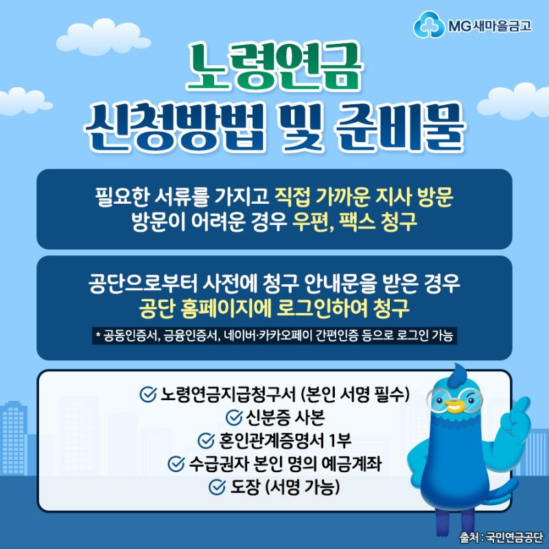 [2] 국민연금공단 - 국민연금(노령연금) 청구는 이렇게 (https://www.nps.or.kr/jsppage/etc/oldagepension/oldagepension01_01.jsp)