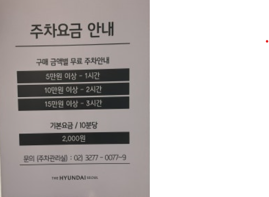 무료 주차 꿀팁: 현대백화점어플-회원가입-메인에서 지점을 더현대서울로 지정-오른쪽 상단 가로줄 3개 선택-서비스카테고리선택-주차정산메뉴 클릭-키오스정산클릭-2시간 무료 주차권 쿠폰이 나옵니다