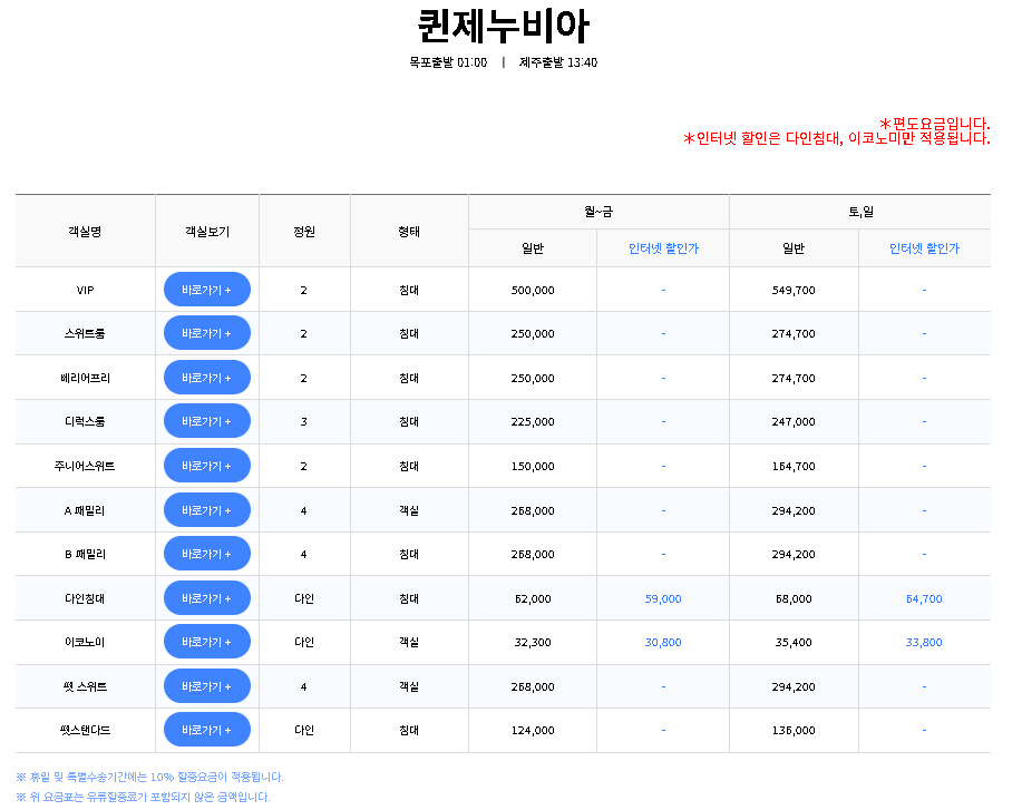 - 퀸제누비아호: 목포 출발 (저녁) - 제주 도착 (아침), 제주 출발 (오후) - 목포 도착 (아침) / 가격: 객실 타입에 따라 5만 원~30만 원 이상