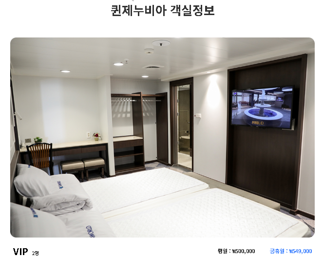 - 선박: 퀸제누비아호 등 대형 크루즈 선박이 운항되며, 객실 종류와 가격이 다양합니다.