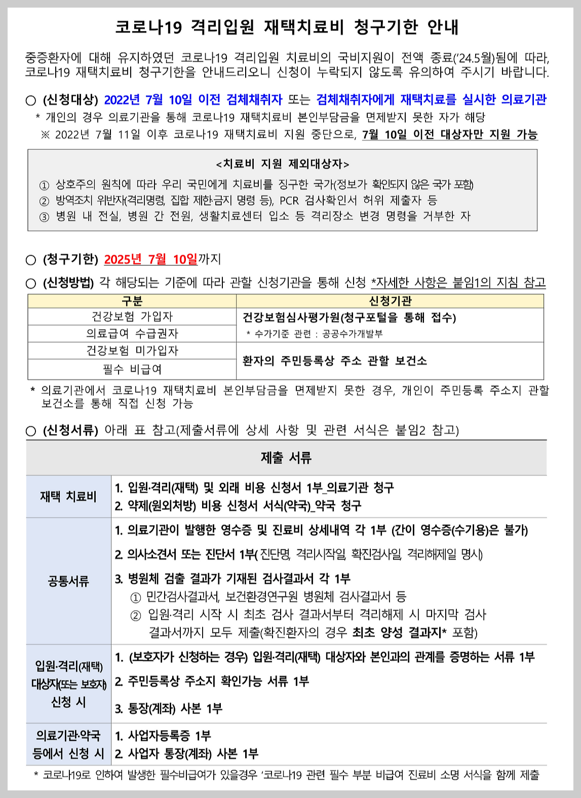 코로나19로 인한 재택치료비는 정부에서 지원하는 제도로, 치료를 받은 환자들이 치료비를 청구할 수 있는 기한이 정해져 있습니다. 이 기한을 놓치면 지원을 받을 수 없으니, 반드시 확인하셔야 합니다. 현재 청구기한은 2025년 7월 10일까지입니다. 이 기한 내에 신청을 완료해야 하며, 이후에는 청구가 불가능하니 주의가 필요합니다.