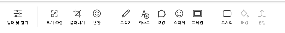 - 크기조절과 잘라내기, 변환은 방향 돌리기, 스티커도 클릭하면 여러 종류가 있어 사용하기 편합니다.